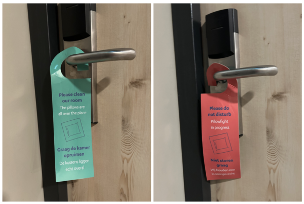 Een detail dat ons echt liet glimlachen waren de deurhangers op de hotelkamer. In plaats van de standaard ‘Niet storen’ stond er bijvoorbeeld: “Niet storen, hier vindt een kussengevecht plaats!”. En als je hem omdraait: “Graag kamer schoonmaken, de kussens liggen echt overal.” Alleen al zo’n grappig detail laat zien dat dit hotel écht gericht is op gezinnen met kinderen.