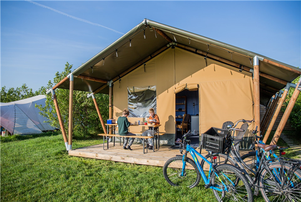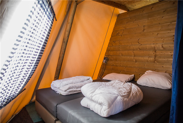 De Tipitent is een volledig ingerichte tent voor vier personen. Door de vorm kan je hier gewoon rechtop staan! In de tent vind je een woonkamertje en keuken en slaapkamers met twee eenpersoonsbedden en een hoogslaper. Een andere compleet ingerichte glamping tent (je slaapt er op lekkere boxsprings!) is de compeet ingerichte safaritent met 2 aparte slaapgedeeltes.